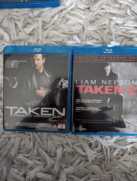 Två stycken Blu-ray filmer med Liam Neeson i huvudrollen. Taken 1 är den utökade versionen med hårdare klippning. Taken 2 är ograderad och innehåller både den ograderade och den teaterversionen.