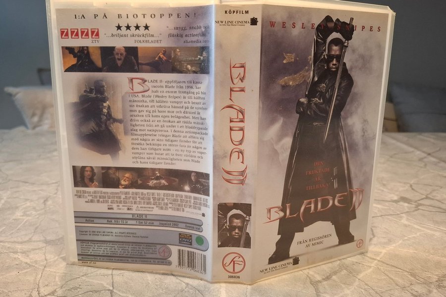 VHS-utgåva av "Blade II" med Wesley Snipes. Filmen är en uppföljare till "Blade" från 1998. Denna actionfilm handlar om Blade som tvingas alliera sig med sina tidigare fiender för att bekämpa en ny typ av supervampyrer. Filmen är från 2002 och har svensk text. Speltid: 1 timme 52 minuter. Rekommenderas från 15 år.