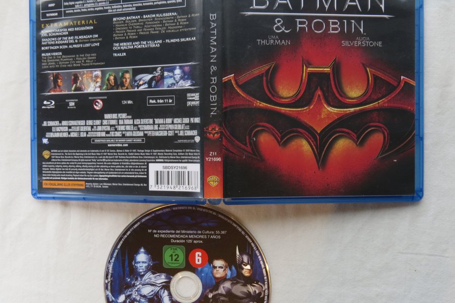 Blu-ray-utgåva av "Batman & Robin" med Arnold Schwarzenegger, George Clooney och Chris O'Donnell. Filmen har en speltid på 124 minuter. Ljudspår inkluderar engelska (Dolby TrueHD 5.1, Dolby Digital 5.1), franska (Dolby Digital 5.1), italienska (Dolby Digital 5.1), spanska (Dolby Digital 5.1, 2.0), tyska (Dolby Digital 5.1) och portugisiska (Dolby Digital 2.0). Textningsalternativ finns på svenska, danska, finska, norska, engelska, franska, holländska, italienska, kinesiska, koreanska, portugisiska, spanska och tyska. Extramaterial är tillgängligt och kan vara i standarddefinition.