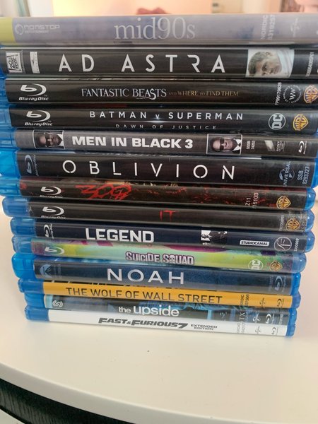 Ett paket med 14 Blu-ray filmer. Innehåller titlarna Mid90s, Ad Astra, Fantastic Beasts and Where to Find Them, Batman v Superman: Dawn of Justice, Men in Black 3, Oblivion, 300, IT, Legend, Suicide Squad, Noah, The Wolf of Wall Street, The Upside och Fast & Furious 7 Extended Edition.