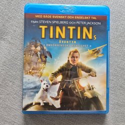 Blu-ray utgåva av Tintins Äventyr: Enhörningens Hemlighet. Filmen innehåller både svenskt och engelskt tal. Regisserad av Steven Spielberg och Peter Jackson.