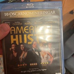 Blu-ray utgåva av filmen American Hustle med Christian Bale, Bradley Cooper, Amy Adams, Jeremy Renner och Jennifer Lawrence.