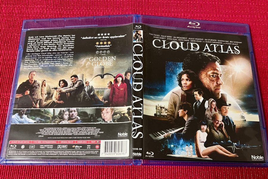 Blu-ray-utgåva av filmen Cloud Atlas från 2012. Filmen är regisserad av Andy och Lana Wachowski samt Tom Tykwer. I rollerna syns bland andra Tom Hanks, Halle Berry, Jim Broadbent, Hugo Weaving, Jim Sturgess, Doona Bae, Ben Whishaw, James D'Arcy, Zhou Xun, Keith David, David Gyasi, Susan Sarandon och Hugh Grant. Speltid är 172 minuter plus extramaterial. Ljudspår på engelska. Textning finns. Filmen är nominerad till Golden Globe.