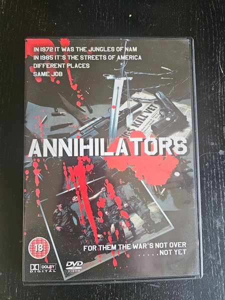 DVD-film med titeln Annihilators. Filmen har texten "IN 1972 IT WAS THE JUNGLES OF NAM IN 1985 IT'S THE STREETS OF AMERICA DIFFERENT PLACES SAME JOB" och "FOR THEM THE WAR'S NOT OVER . . . . . NOT YET" på omslaget. Den är märkt med en åldersgräns på 18 år och har Dolby Digital-ljud.