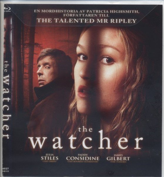 Blu-ray utgåva av filmen The Watcher med Julia Stiles, Paddy Considine och James Gilbert. En thriller baserad på en mordhistoria av Patricia Highsmith, författaren till The Talented Mr. Ripley. text: svenska norska danska finska
