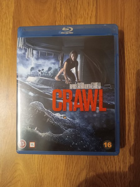 Blu-ray-film med titeln Crawl. Från producent Sam Raimi och regissör Alexandre Aja. Åldersgräns 15 och 16.