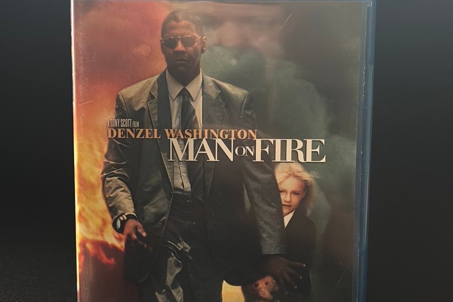 Blu-ray-utgåva av filmen "Man on Fire" med Denzel Washington i huvudrollen. Filmen är regisserad av Tony Scott och presenteras i 1080p med DTS-HD Master Audio.