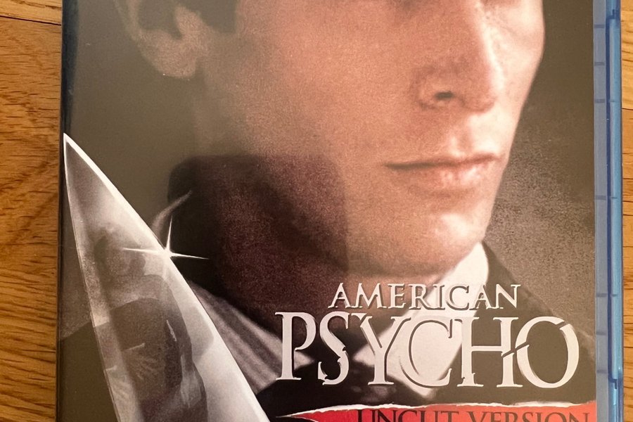 Blu-ray-utgåva av "American Psycho" i oklippt version. Filmen är märkt med "15" för åldersgräns och erbjuder en upplevelse i hög upplösning.