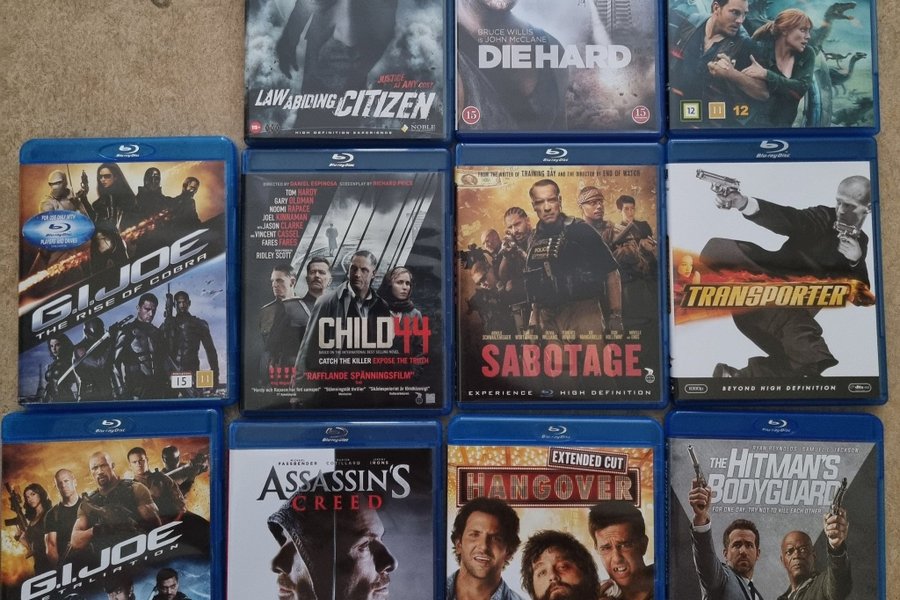 Filmpaket med Blu-ray filmer inklusive Law Abiding Citizen, Die Hard, Jurassic World Fallen Kingdom, G.I. Joe: The Rise of Cobra, Child 44, Sabotage, Transporter, G.I. Joe: Retaliation, Assassin's Creed, The Hangover (Extended Cut), och The Hitman's Bodyguard.