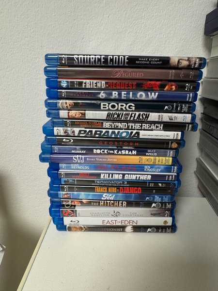 Blu-ray filmsamling med titlar som Source Code, The Beguiled, Friend Request, 6 Below, Borg, Ricki and the Flash, Beyond the Reach, Paranoia, Geostorm, Rock the Kasbah, SVJ Stora Vänliga Jätten, Selfless, Killing Gunther, Terminator 3, Franco Nero Django, Ted, The Hitcher, East of Eden, The Illusionist.
