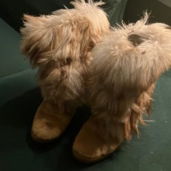 Otroligt Elegant, ärmlös klänning i en ljus nyans. Klänningen har en v-ringning som är dekorerad med pärlor. Den har en figurnära passform upptill och en utsvängd kjol med volanger och halvsläp nedtill. Klänningen stängs med en dragkedja i ryggen. Klänningen är något stor för modellen på bilden. Silke och täckt med spets.