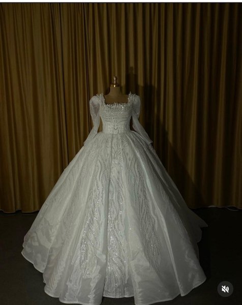 En vit brudklänning med långa ärmar och fyrkantig halsringning. Klänningen har intrikata pärlbroderier på överdelen och ärmarna, samt glittrande detaljer i ett vågigt mönster över hela kjolen. Kjolen är mycket voluminös och har ett långt släp, vilket ger en kunglig och elegant känsla. Ärmarna är puffiga vid axlarna och smalnar av mot handlederna. Klänningen är designad för att ge en storslagen silhuett.