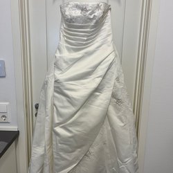 Brudklänning från La Sposa. Väldigt fint skick. Ej kemtvättad, därav priset. Endast lite smutsig nertill men inga större fläckar (se bild, finns även en bild på undersidan av tyget nertill), bör gå bort utan problem i en kemtvätt.