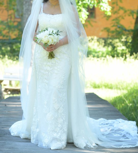 Elegant brudklänning och ett avtagbart släp. Klänningen har en figurnära silhuett och en vacker halsringning.
