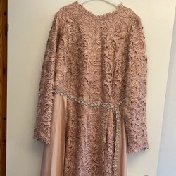 Långärmad klänning med paljetter och tyllkjol. Klänningen har en rund halsringning och en dragkedja baktill. Överdelen är i spets med paljetter och kjolen består av flera lager tyll.