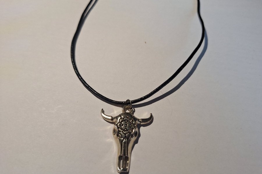 Halsband med ett hänge i form av ett tjurhuvud. Hänget är silverfärgat och har detaljerade mönster. Konstläder kedja.