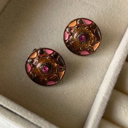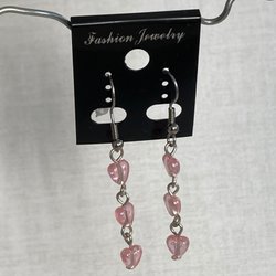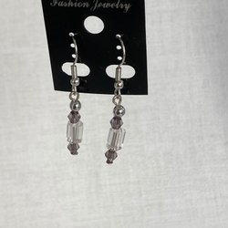 Ett par örhängen med ljus och mörk lila och rosa pärlor. Örhängena har silverfärgade krokar.