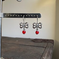 Ett par röda örhängen med silverfärgade detaljer. Örhängena har en rund form och ett dekorativt mönster.