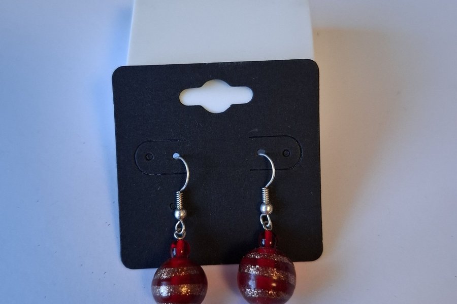 Ett par röda örhängen med silverfärgade detaljer. Örhängena har en rund form och hänger från silverfärgade krokar.