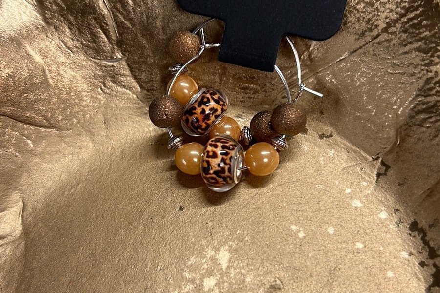 Ett par handgjorda örhängen med pärlor i olika bruna nyanser och leopardmönster. New age. Unika!