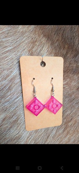 Ett par rosa örhängen formade som legobitar. De hänger från silverfärgade krokar och presenteras på en brun kartongbit.