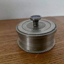 Rund ask eller skål i trä. Lock med knopp, se bilder. Välbevarat skick. Inristat i botten årtalet 1785. Diameter 22 cm, höjd med knopp ca 12 cm. Liten nagg på locket.
