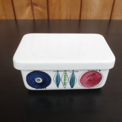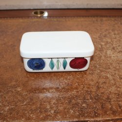 En smörbytta men som har märken så det ser ”bränt” ut. Har inte testat att få bort det men det syns inte när locket är på.