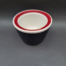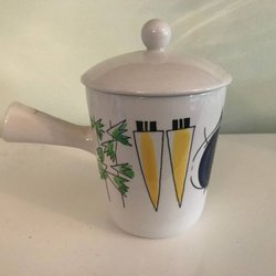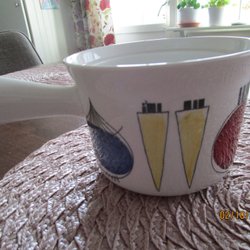 En skål/karott med handtag som är ugnssäker, har två nagg. Se bild 6 och 7.