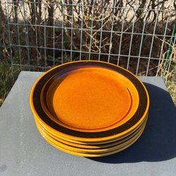 Två tallrikar från Rörstrand, modell Tuna. Tallrikarna är bruna med en svart kant.