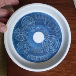 Diameter 36 cm. Höjd 4.5 cm. Vikt 2.8 kg.