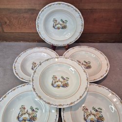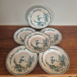 6 djupa tallrikar med elegant guldkant från Rörstrand, årsstämplade 1955. Fint skick, ser ut att ha varit sparsamt använda. Inga skador, nagg eller sprickor. Se bilder för egen uppfattning om skick. Ca 24,5 cm i diameter.