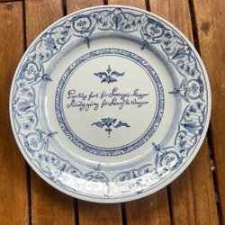 Prydnadstallrik från Rörstrand med blå dekor och texten "Lycklig fart för Sveriges flaggor ständig gång för Svenska waggor". På baksidan finns en silverplatta . Stämplar ANA . H .tre kronor S . V 9 . 925 S . Diam. 21 cm.