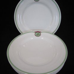 Sex assietter från Rörstrand, blekguls med ränder på sidorna.