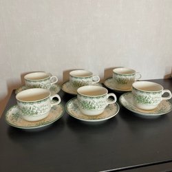 Tre stycken tekoppar med fat plus två extra fat. Grön Anna, Rörstrand. Samtliga koppar har krackelerad glasyr och missfärgningar, se bilder. Två av faten mindre krackelering, dock ej missfärgningar. Inga nagg på koppar eller fat som jag hittat.