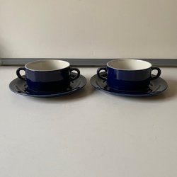 Rörstrand Sejdel beige med blå dekor. Höjd lite drygt 14 cm, diameter ca 12 cm utan handtag och ca 18 cm diameter med handtaget.