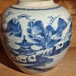 Vit med blå kant och blommönster i mitten. Prickar i glasyren finns, se bilder. Botten är jättefin, inga skador eller krackeleringar. Tror att den aldrig är använd.