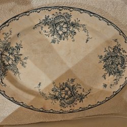 Två ovala fat med ett detaljerat grönt blommönster och en dekorativ kant. Faten har en vit bottenfärg och en guldfärgad rand längs kanten.