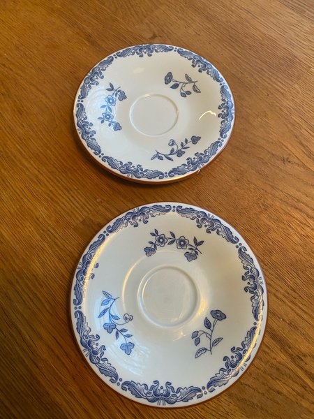 Två fat med ett detaljerat blått blommönster och en dekorativ kant. Faten är vita med en tunn brun rand längs kanten.