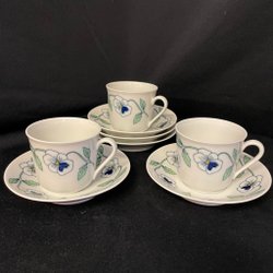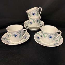 Fem kaffekoppar, 6 fat, 12st assietter, 1 Gräddkanna, 1 sockerskål