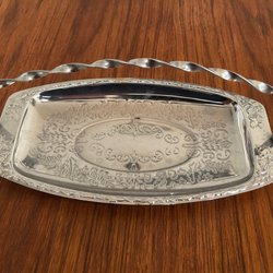 Oval serveringsfat från Rörstrand, serien Vesta. Guldfärgade detaljer längs kanten och på handtagen. Guldet något slitet. En mycket liten prick bredvid den mindre blomman. Längd ca 30,5 cm, bredd ca 21 cm.