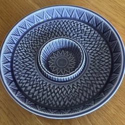 Vas i vacker blålila färg med mönster från Rörstrand, modell scherzo. Ca 21 cm hög, diameter 8cm i öppningen. Fint skick!