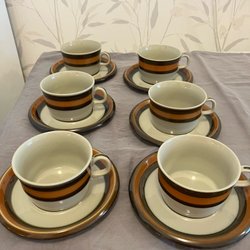 Ett fat från Rörstrand ur serien Annika. Fatet har ett mönster med en bred svart rand och en smalare orange brun rand längs kanten. Diam. ca 20 cm