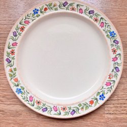 Avlångt fat från Rörstrand. Fatet är i benvitt porslin med ett mönster av stiliserade blommor i mitten och längs kanterna.