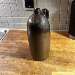 Stenkrus från Höganäs med handtag. Kruset är brunt och har texten "HÖGANÄS" samt "HB" inpräntat.