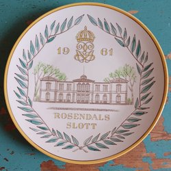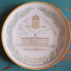 Dekorativ tallrik med motiv av Gripsholms Slott, krona och årtalet 1953. Märkt RMR på baksidan.