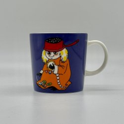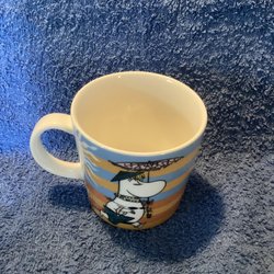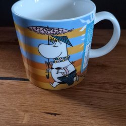 Muminmugg Strandliv säsongsmugg sommar 2008 med ett par vita prickar på bild två.