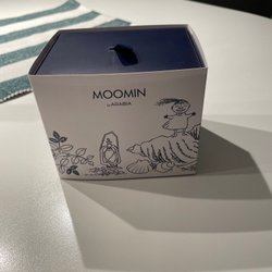 Muminmugg från Arabia. Muggen är blå med motiv av Muminfamiljen och fåglar. Den är märkt ”MOOMIN CHARACTERS TM by ARABIA” undertill.
