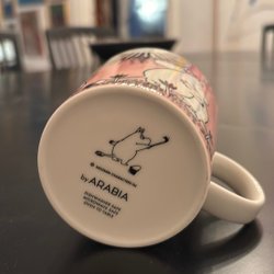 Muminmugg från Arabia. Muggen är blå med motiv av Muminfamiljen och fåglar. Den är märkt ”MOOMIN CHARACTERS TM by ARABIA” undertill.