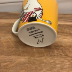 Muminmugg i rosa med motiv av Muminfigurer.