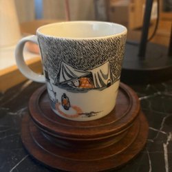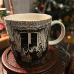 Muminmugg med motiv av Mumintrollens vinter. Muggen är designad av Tove Slotte och tillverkad av Arabia. Den är diskmaskinsäker, mikrovågsugnssäker och ugnssäker.